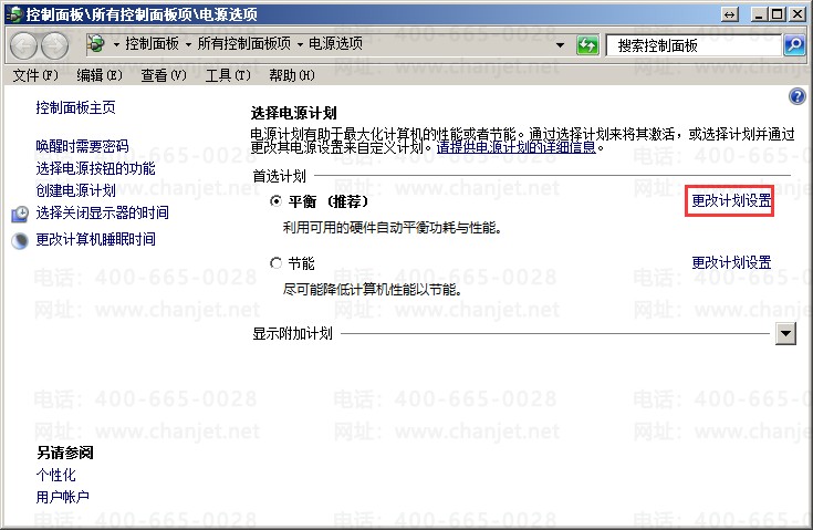 E、找到当前选择的电源计划,并点击“更改计划设置”;