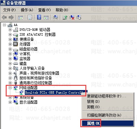 B、在设备管理器中,找到“网络适配器”,鼠标右键点击后,选择“属性”