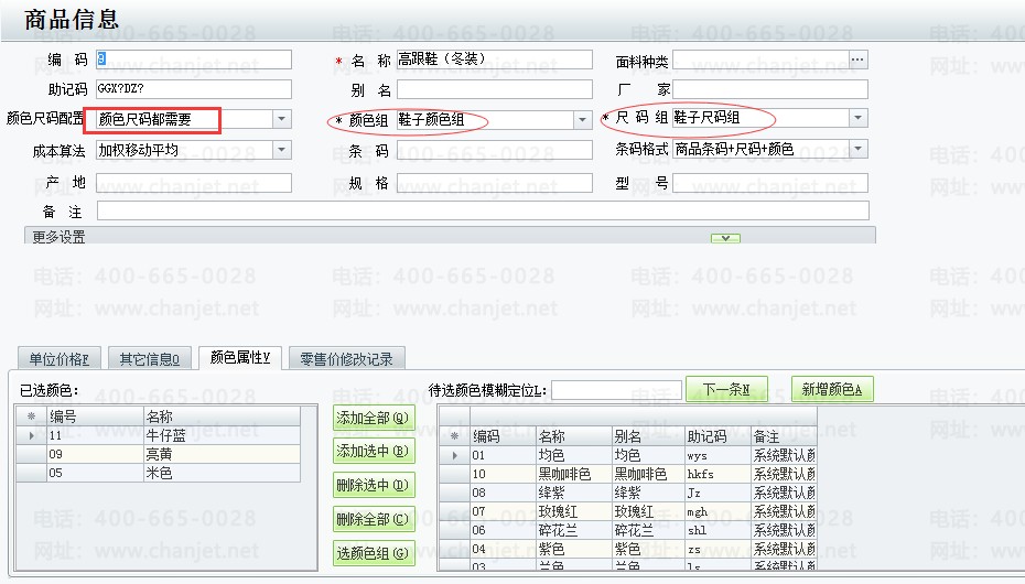 进入【基本信息】—【商品信息】,添加一个商品为“高跟鞋(冬装)”,颜色尺码配置选择“颜色尺码都需要”,颜色组选择“鞋子颜色组”,尺码组选择“鞋子尺码组”保存。