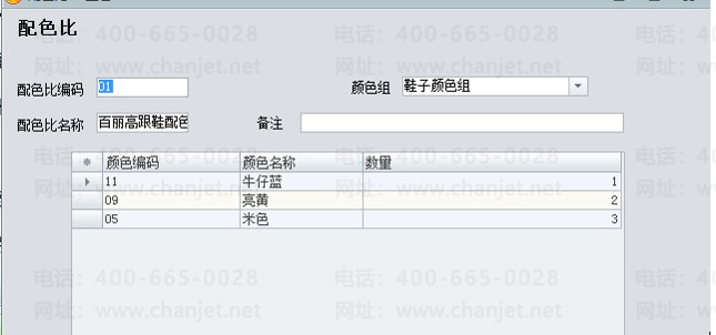 配色比:指的是一批货中各颜色的标配是固定的,如一包均码的鞋子中固定牛仔蓝有1双,亮黄有2双,米色3双,那么可以添加一个配色比。