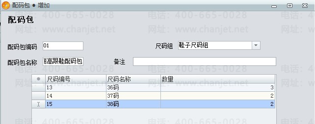 3、保存后,那么使用了“鞋子尺码组”的商品可以使用配码包来进货。