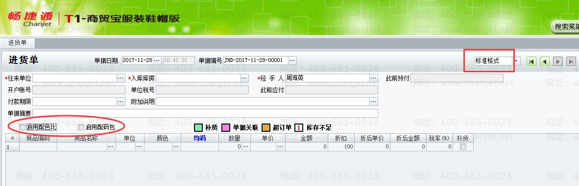 1、打开进货单,页面格式选择标准格式,才有“启用配色比”和“启用配码包”选项。