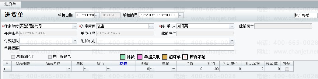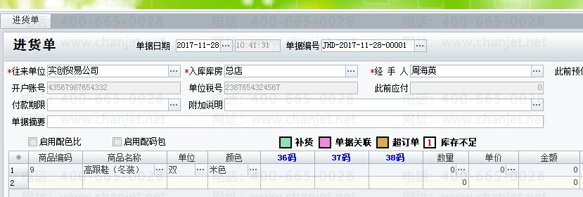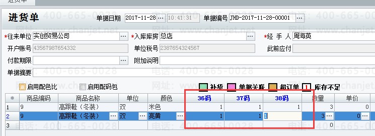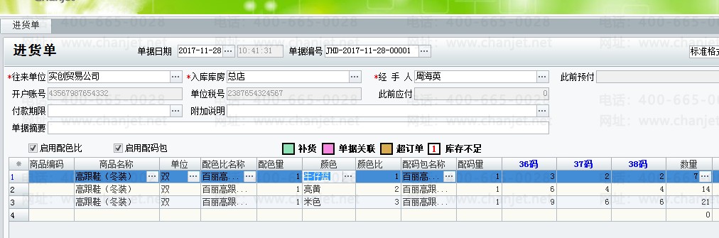 配色比和配码包是服装鞋帽版11.5新增的功能,功能体现在进货单、销售单、委托发货单、受托收货单、赠送单等单据上。下面以进货单为例讲解配色比和配码包的作用。