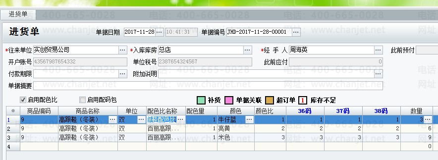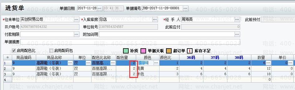 4.3、双击选中配色比后,回到进货入库单界面,【配色量】默认是1,【颜色比】为各颜色的配色比例1、2、3,由于此商品含有3种尺码,则每个尺码都按照配色比默认填充各颜色数量。