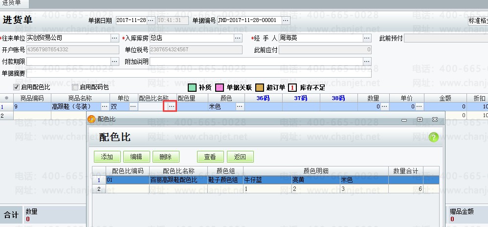 3、点保存后,颜色组为“鞋子颜色组”的商品在进货时都可以使用配色比。