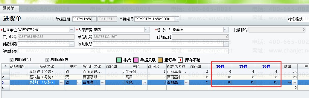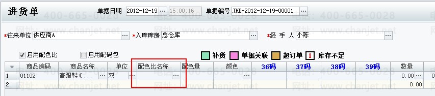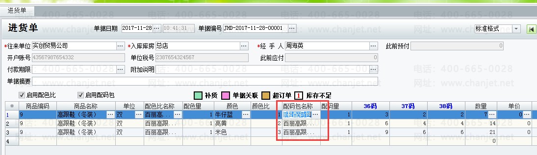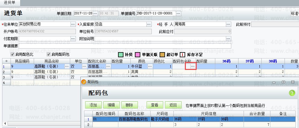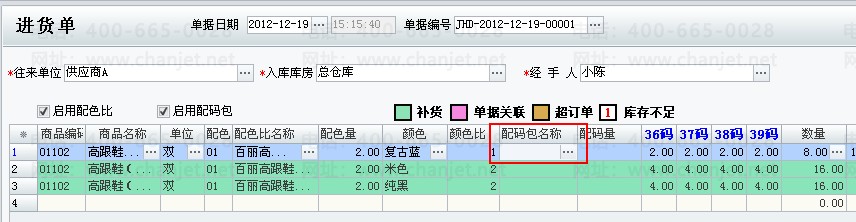 4、若供应商供货的颜色、尺码在每个包装中是固定,就可以使用配色比和配码包来进货,免去手工录入数量的麻烦。