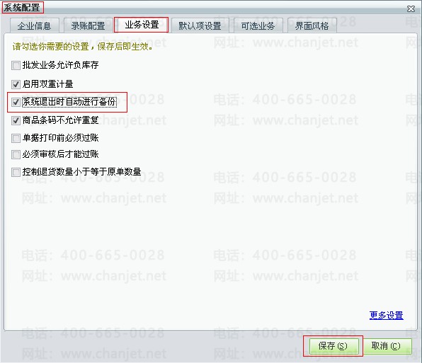 在登陆商贸宝软件里点击“维护中心”—“系统配置”—“业务设置”在业务设置里勾选“系统退出时自动进行备份”并点击保存即可。