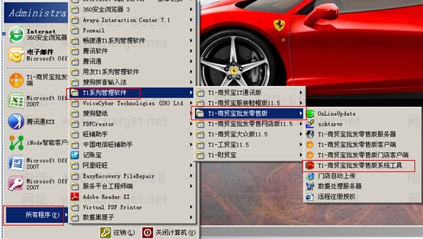 点击电脑左下角的“开始”—“所有程序”—“T1系列管理软件”—“T1-商贸宝批发零售版” —“T1-商贸宝批发零售版系统工具”。