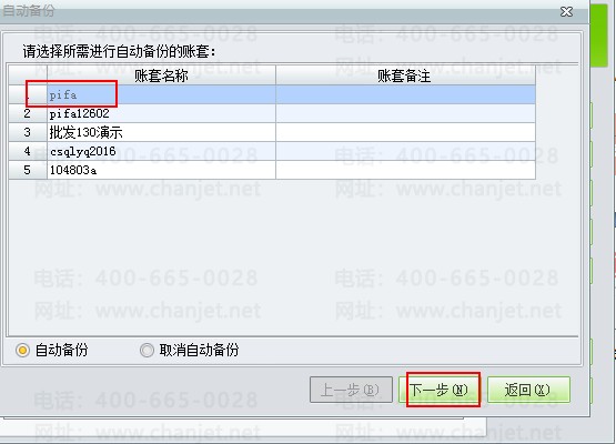 在弹出的界面里选择好账套、选中自动备份,点击下一步。