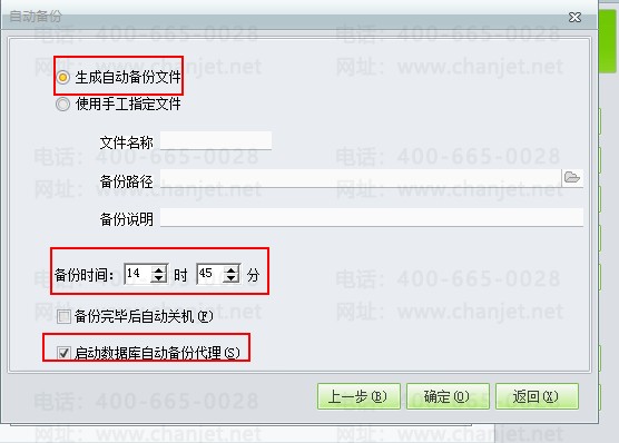 备份方法一:生成自动备份文件,这种方法是不能录入文件名称,备份路径和备份说明的,备份时间设置好后,每天这个时间软件就会自动备份数据。一定要勾选启动数据库自动备份代理,如果不启动它,软件就不能自动备份数据。
