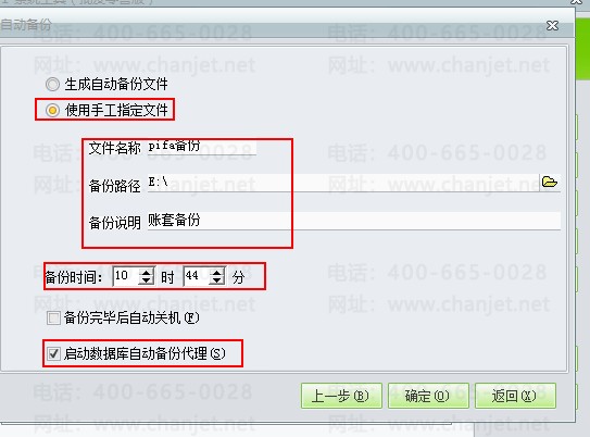 备份方法二:使用手工指定文件,这种方法是能录入文件名称,备份路径和备份说明的,备份时间设置好后,每天这个时间软件就会自动备份数据。一定要勾选启动数据库自动备份代理,如果不启动它,软件就不能自动备份数据。