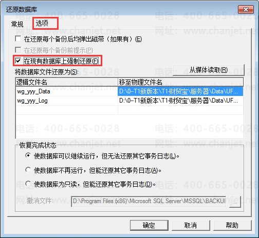 ④、重新回到常规界面,将“还原为数据库名”修改为ufcmbys
