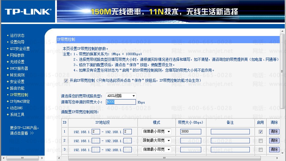 2.其次进入IP带宽控制,进行网络资源的分配(例如服务器IP为192.168.1.2,其它计算机分别为192.168.1.3和192.168.1.4,申请的带宽大小为4000Kbps):限制时,有两种情况: