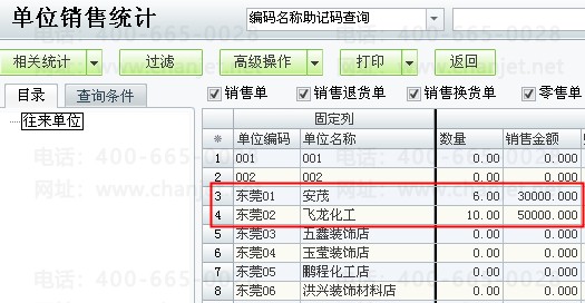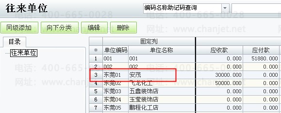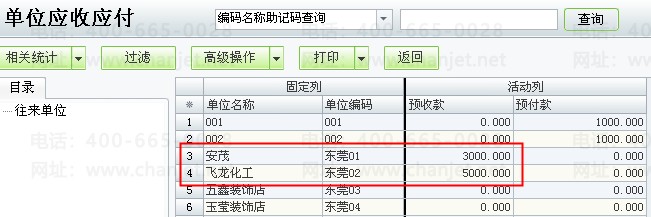 会计凭证过账后,在“信息中心—钱流信息—单位应收应付查询”中查看安茂和飞龙化工的预收账款分别增加3千和5千。