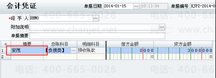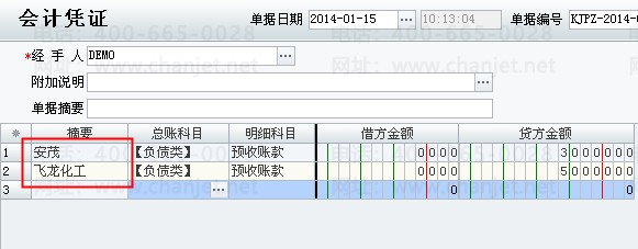 往来单位会自动带入到摘要中,预收账款属于负债类,负债类增加做在贷方,金额录入3千。