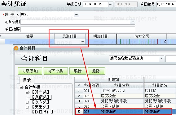 进入“钱流单据—会计凭证”,选择经手人,第一个总账科目选择【负债类】中的预收账款。
