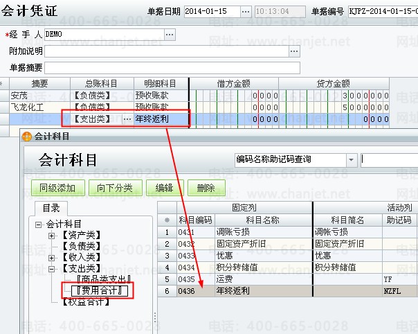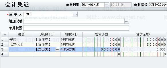 第三个总账科目选择【支出类】中费用合计下的年终返利,金额录入合计数8千。这个费用类型可以在“基本信息—费用类型”中先添加好。