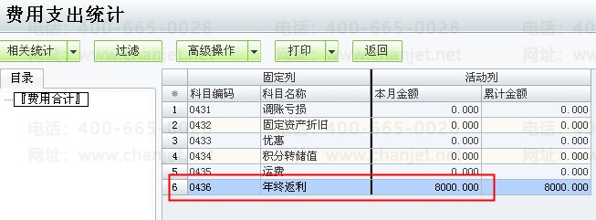 在“信息中心—钱流信息—费用支出统计”中查看年终返利的费用增加了8千。