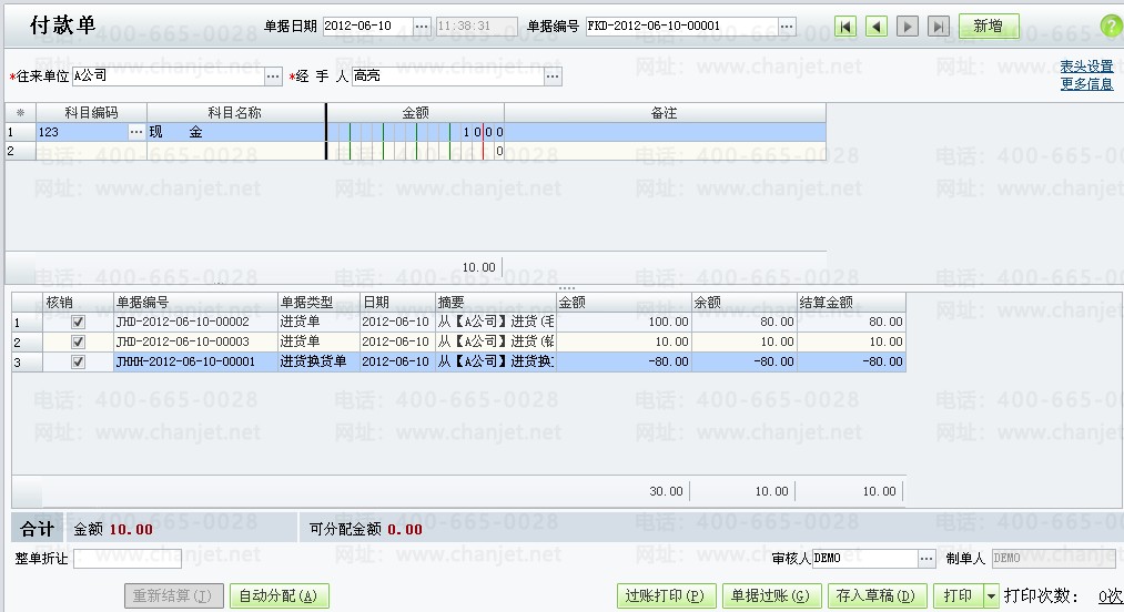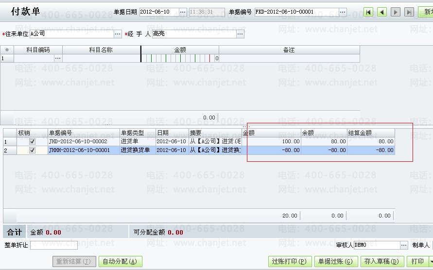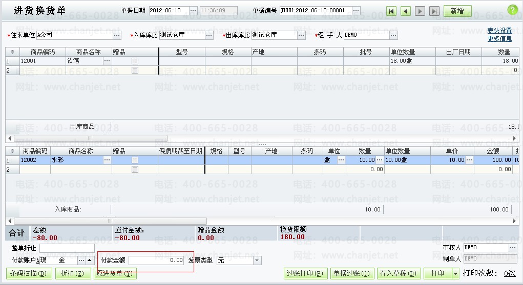 向A公司进了一批铅笔,成交金额是180元,后来发生换货业务,换入一批100元的水彩。此时A公司欠我公司80元。后与该公司进了一批毛笔100元,这次只需要支付20元。如何在软件中实现?