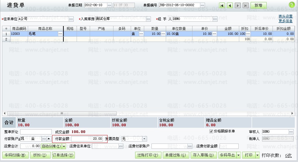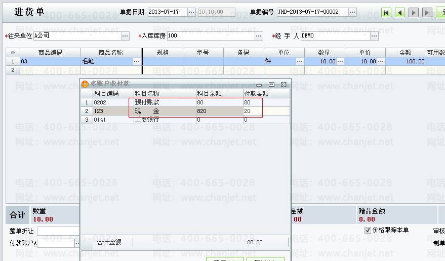 下一次再向该往来单位进了一批毛笔,做进货单,因为之前公司应付我方80元,故本次成交100元,只需支付剩下的20元即可。在软件中这张单据如此处理会形成80元的应付款。