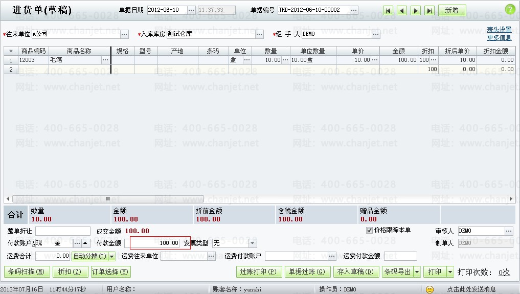 进毛笔时做进货单,付款账户填写全部的交易款项。