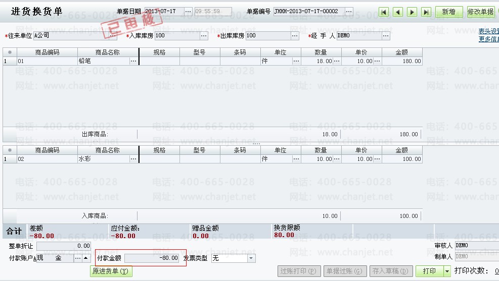 做进货换货单付款金额直接填写差额-80元,此时现金账户会增加80元。