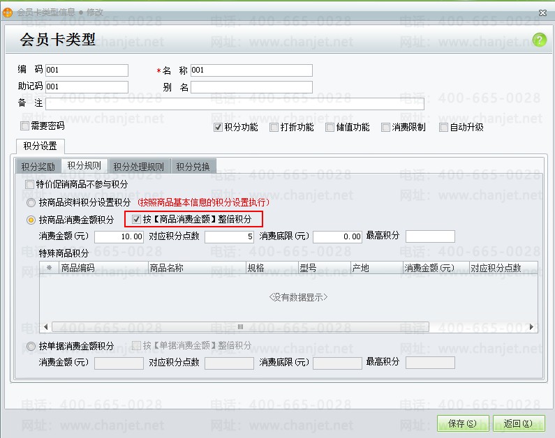 按【商品消费金额】整倍积分功能的说明:按照积分比例中'消费金额'的整数倍数进行积分运算,非整数倍数部分,不积分。