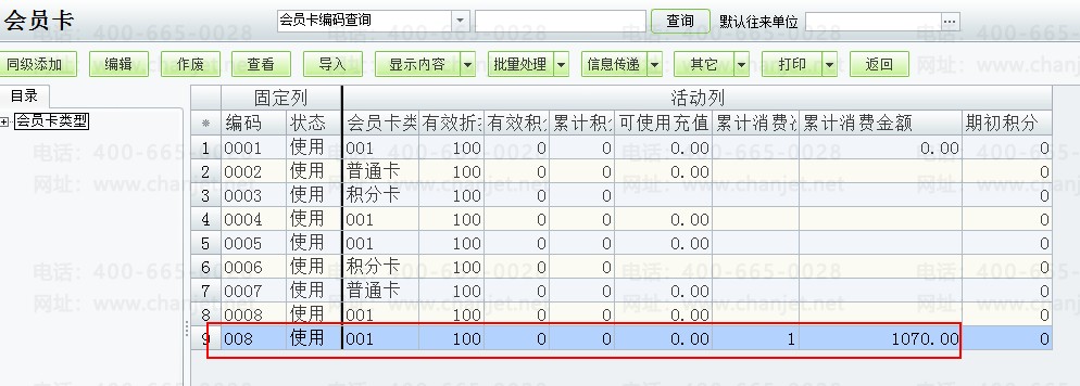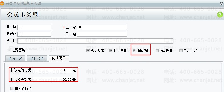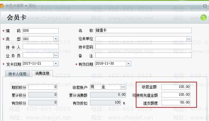 增加一张会员卡,初始收款为100可以使用的金额为100,透支额度为50