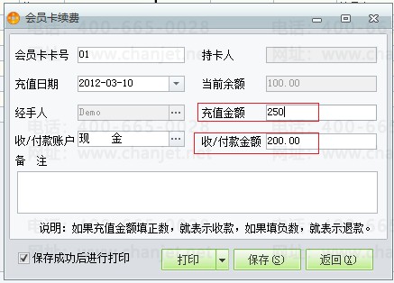 在收付款金额处填写实际收到的金额,而充值金额则需要填写实际收款金额和赠送金额的总和,这部分差额记录在“会员卡充值金额与实际收款差异”中。