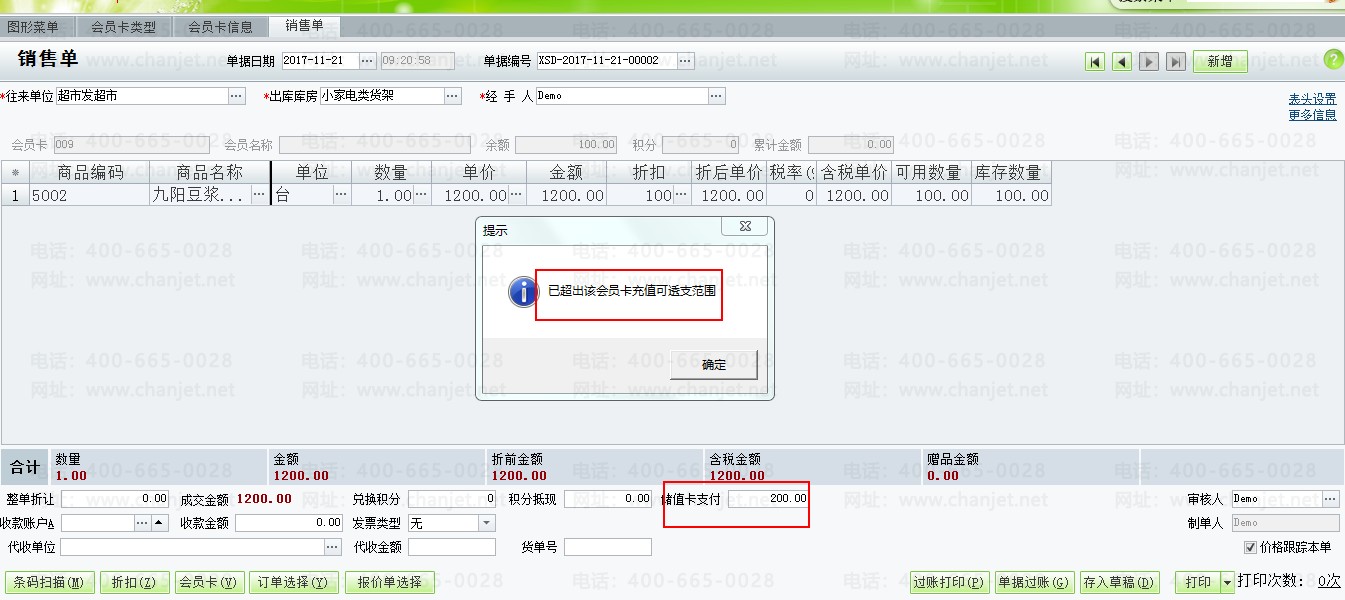 当输入的储值卡支付金额大于可以使用的金额时单据过账会如图提示