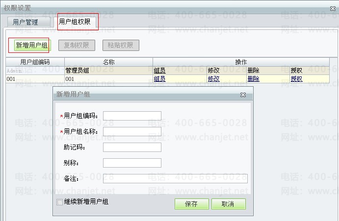 1、在维护中心中的用户权限——用户组权限里面添加用户组,输入编码和名称,点击保存;如图所示:
