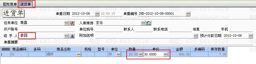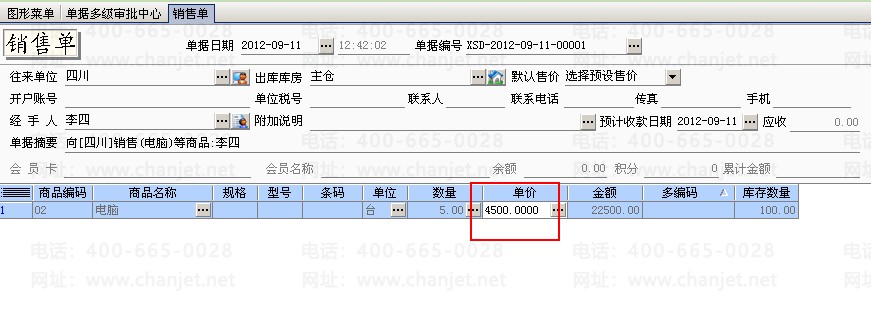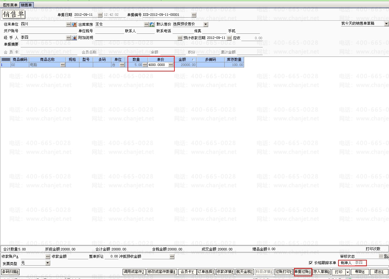 员工李四,销售5台电脑,做销售出库单,销售单价为4000元/台。