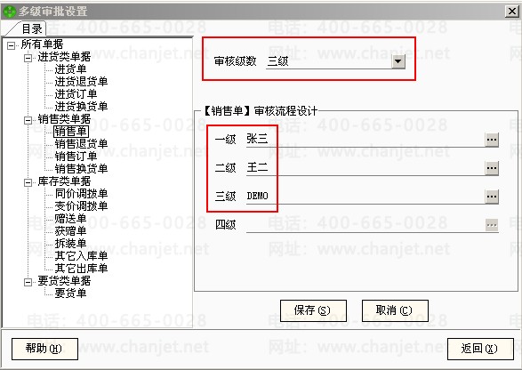 2、下面我们选择销售单,设定审核级数为三级。设定好后以不同级次审核人的身份进入软件对其单据进行审核。