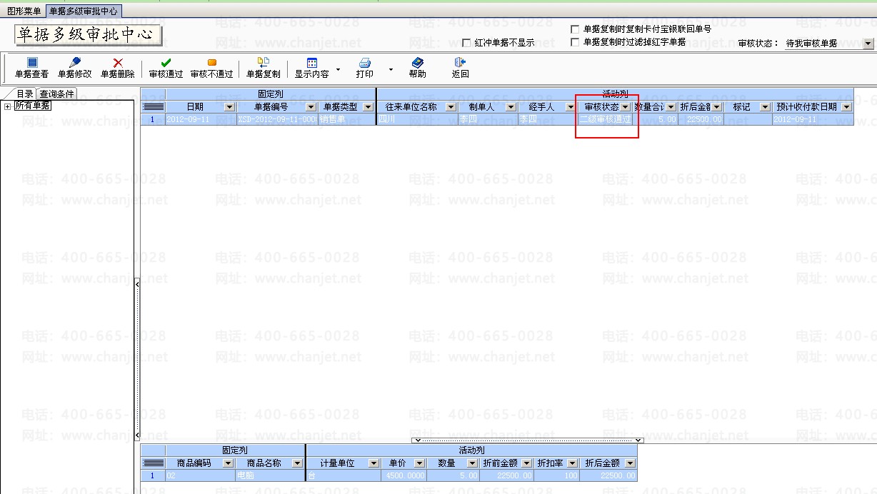 在二级审批查看单据时,可以看到审核状态为“一级审批通过”