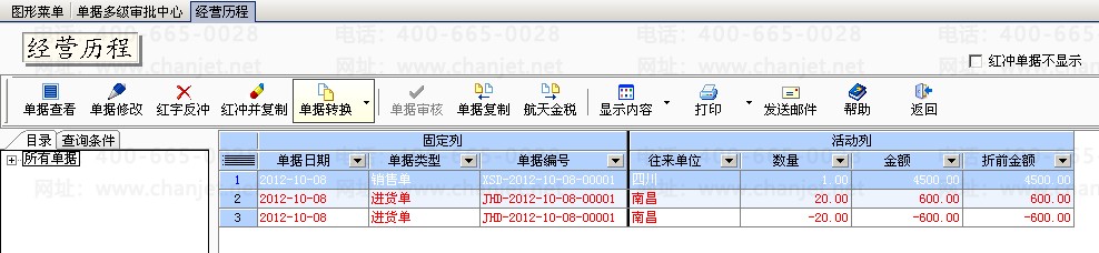 审核通过的单据,制单人可以到“经营历程”里进行红冲