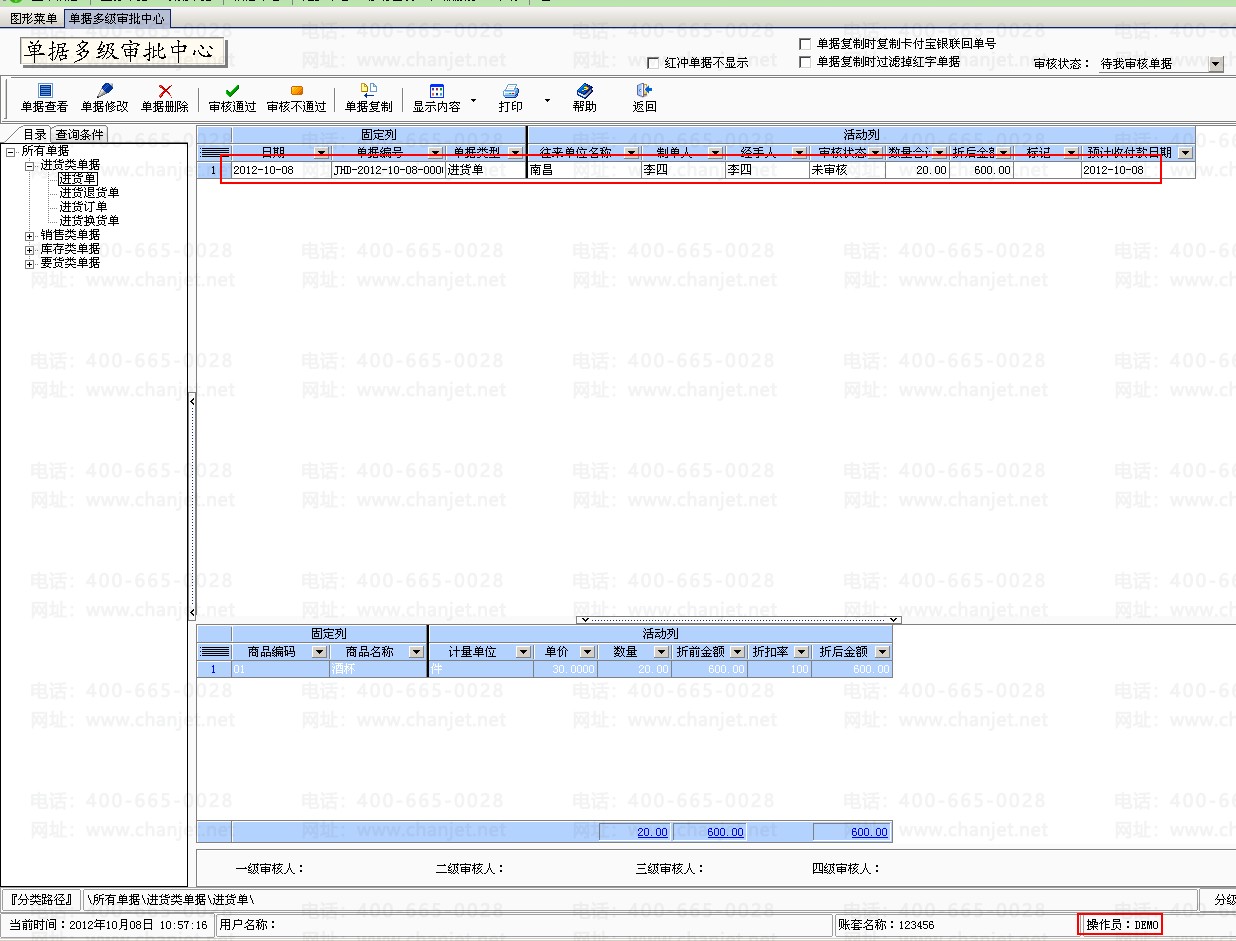 假如张三没有审核进货单据的权限,这里可以看到,只有demo账号可以审核进货单据。