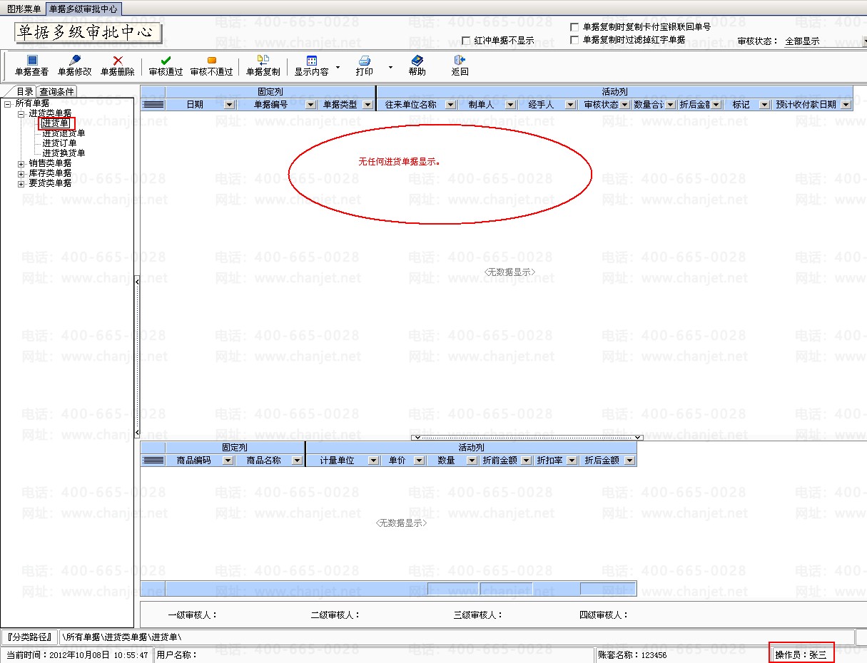 张三进入软件进行审核,在“单据多级审批中心”里并没有进货单据。