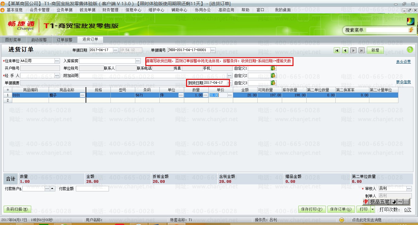 (1)填制采购订单,并且录入【到货日期】
