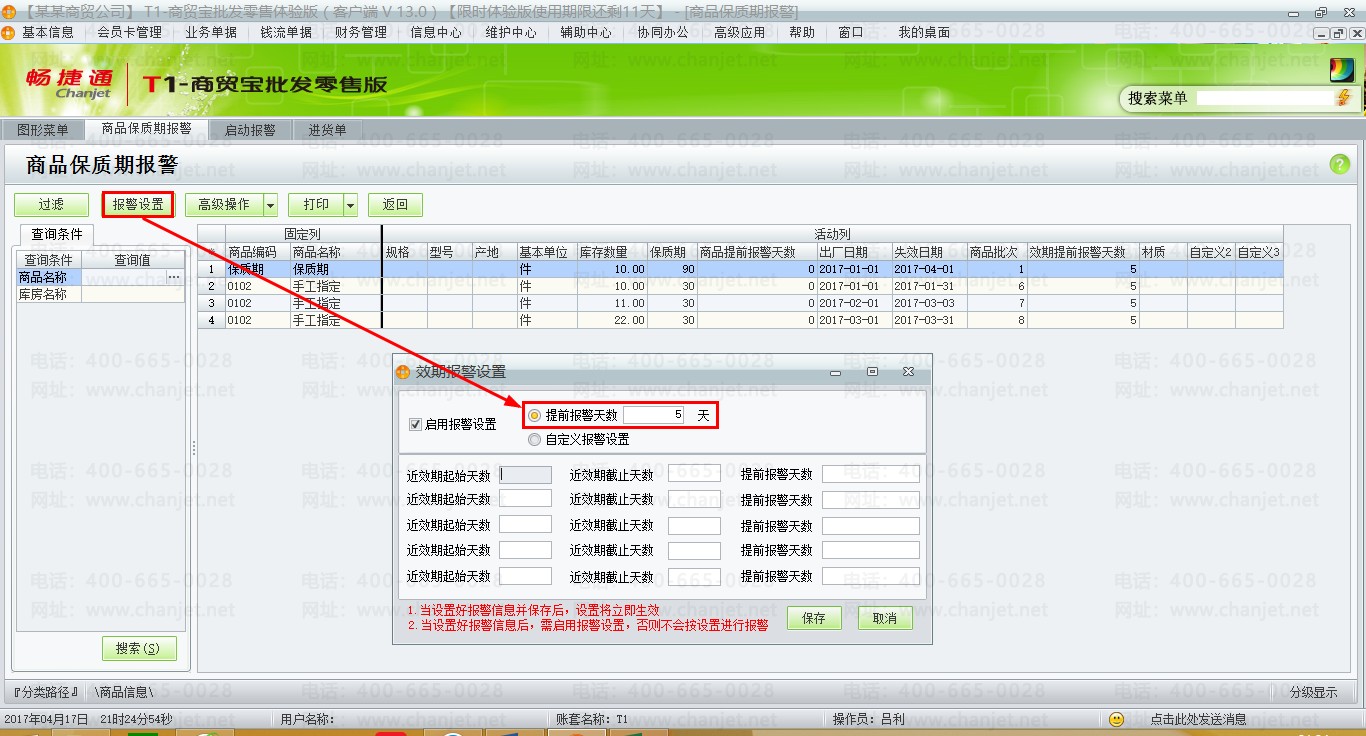 (1)【辅助中心】-【商品保质期报警】,设置提前报警天数