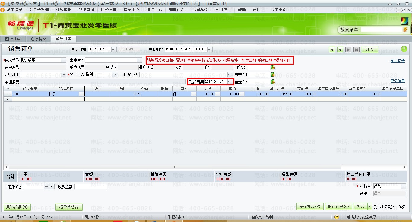 (1)填制销售订单,录入取货日期