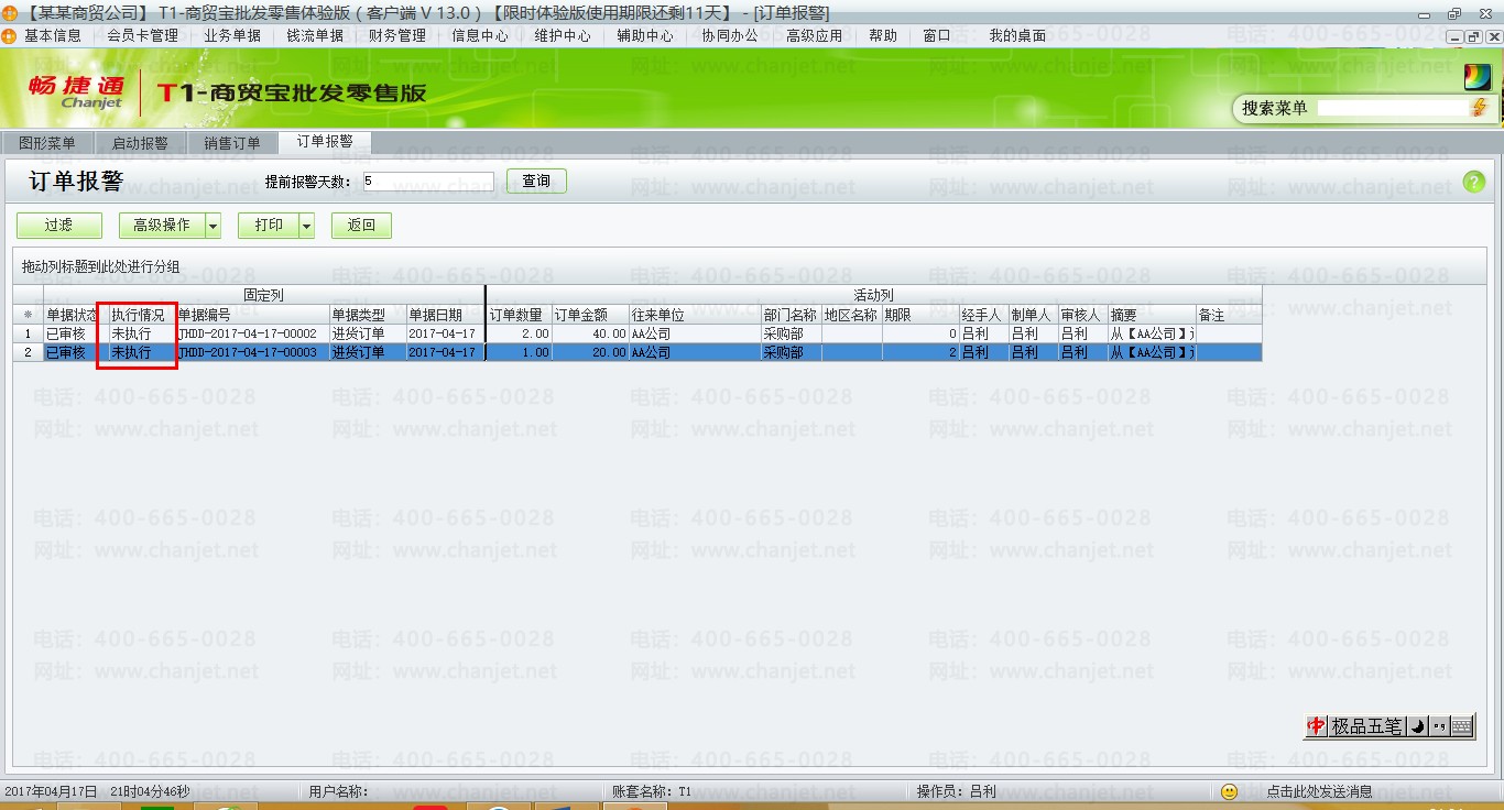 (3)当单据未执行,或执行了一半,显会在【辅助中心】-【订单报警】中体现,条件为:订单的到期日期-系统日期小于等于提前天数,如果单据执行完毕,则不会在此体现。