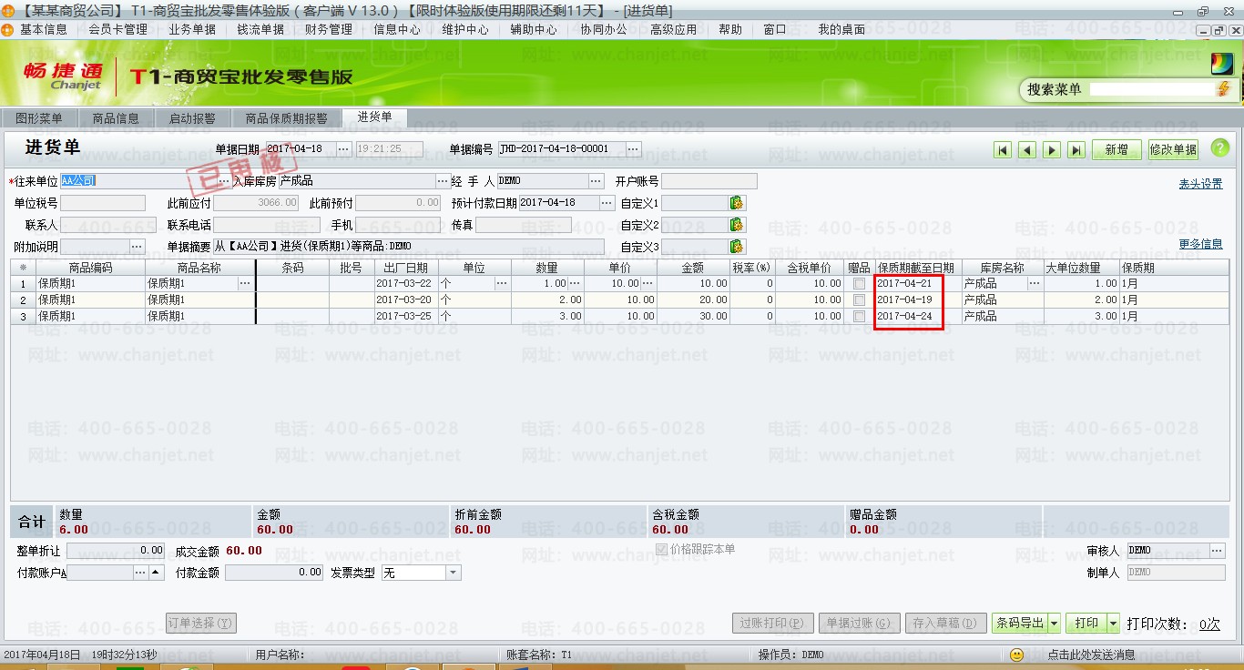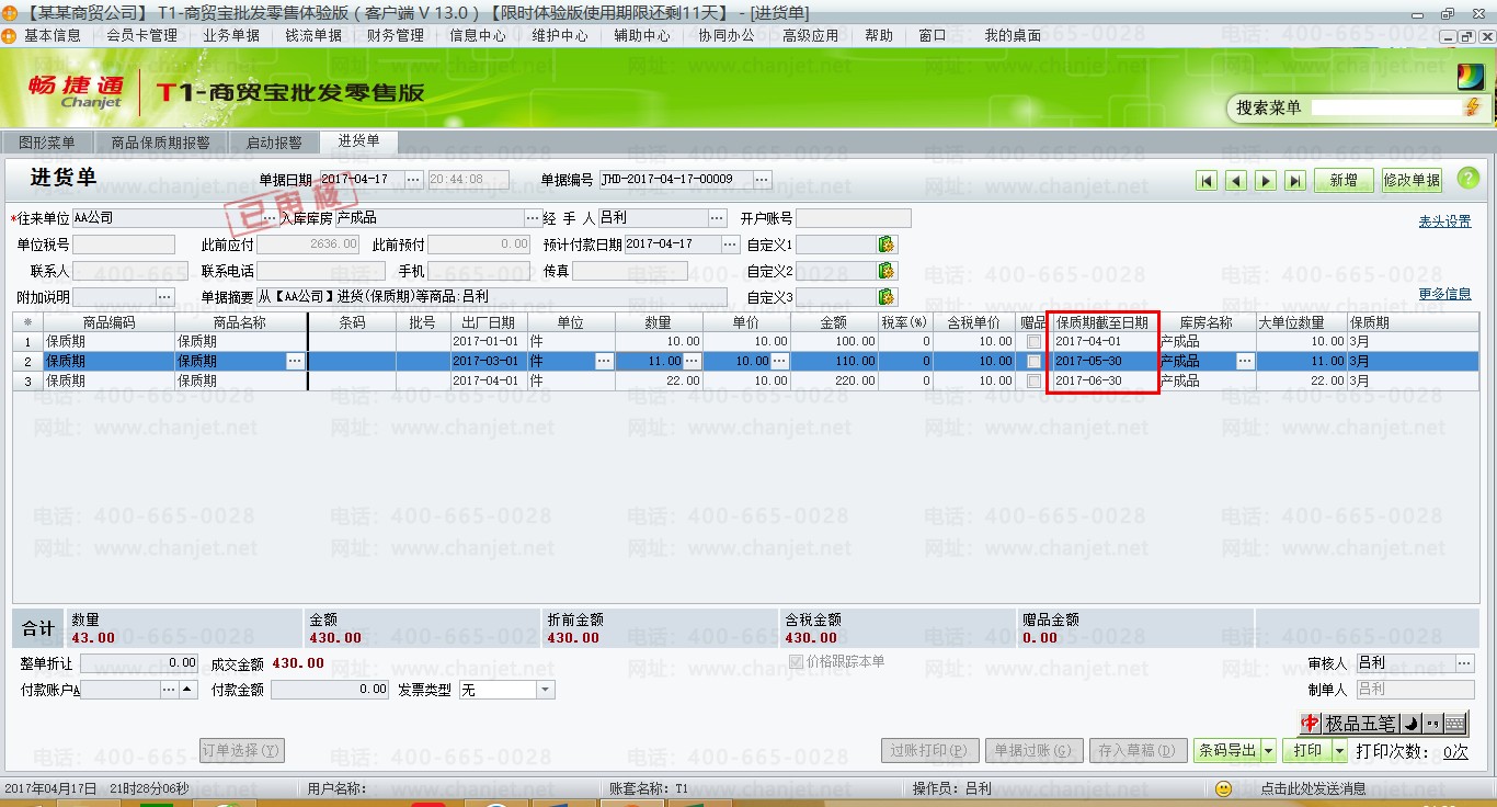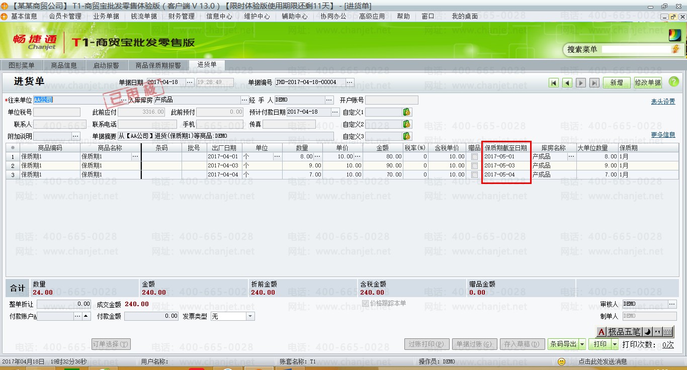 (2)填制进货单,并且确定【保质期截止日期】