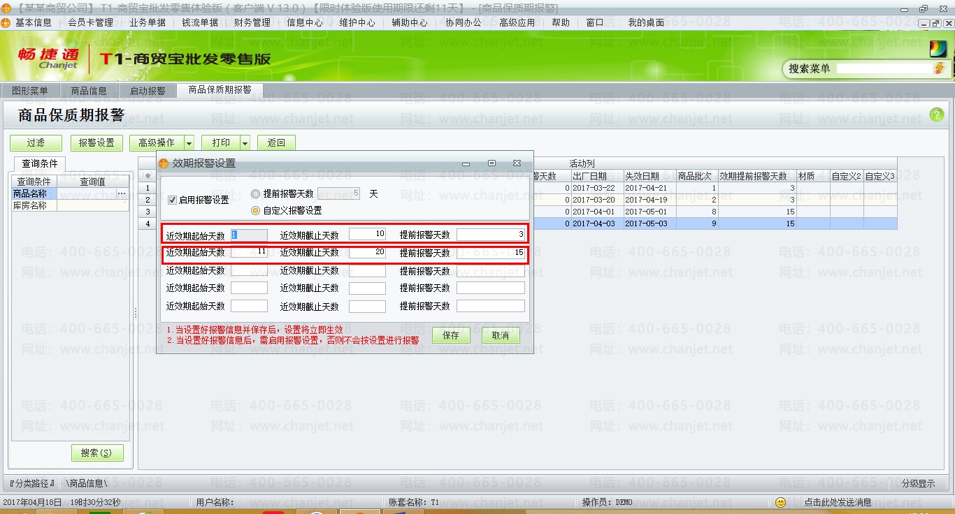 (1)【辅助中心】-【商品保质期报警】-设置近效期天数及提前天数。备注:近效期起始天数至近效期结束天数为1至10天,意思是指商品的失效日期在快过期的1至10天内,而提前报警天数为3是指,商品失期日期-当前系统时间小于等于提前报警天数3,则会有相应的记录体现出来。近效期起始天数至近效期结束天数为11至20天,意思是指商品的失效日期在快过期的11至20天内,而提前报警天数为15是指,商品失期日期-当前系统时间小于等于提前报警天数15,则会有相应的记录体现出来。