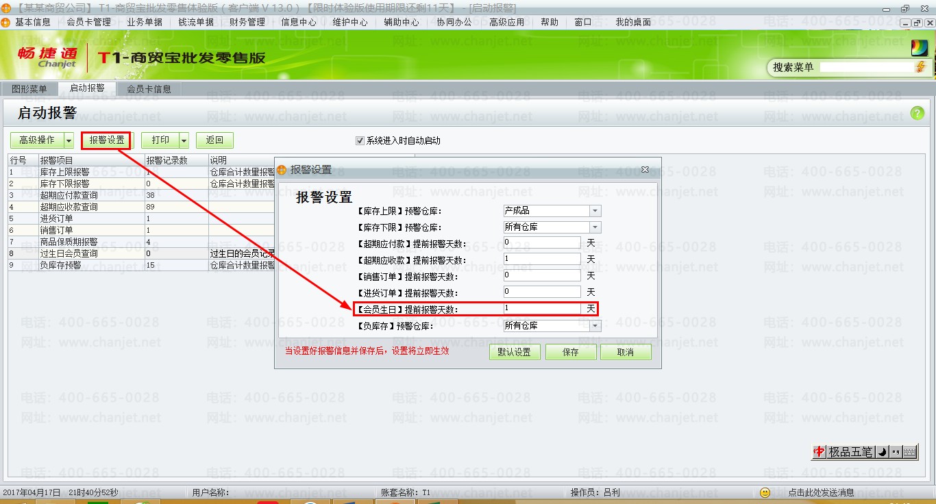 (2)【设置报警】-【会员生日提前天数】