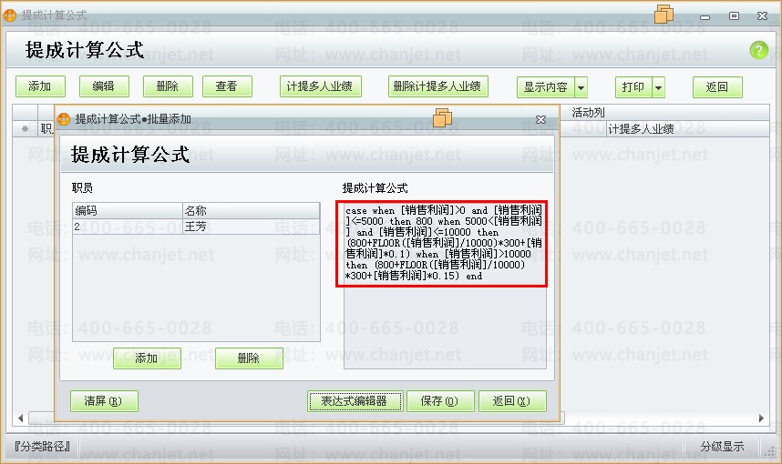 在上例中使用了FLOOR([销售利润]/10000)*300,用来表示销售利润每满10000元就额外奖励300元,使用到了数学函数FLOOR(A),此函数的含义为,返回小于或等于所给数字表达式的最大整数,即取整数,业务提成方案中的数学函数还有,返回给定数字表达式的绝对值:ABS(A);返回数字表达式并四舍五入为指定的长度或精度:ROUND(A,N)等。在设计业务员提成时,可以灵活运用这些数学公式。