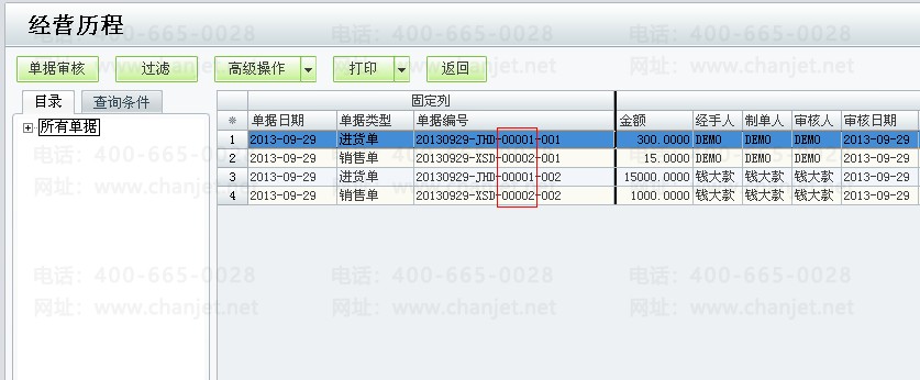预览效果如图,demo、钱大款的单据编号是区分制单人,编号计数互不干扰,都从00001开始计数。