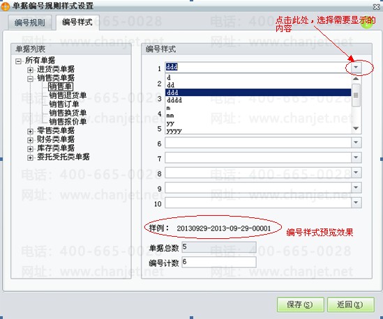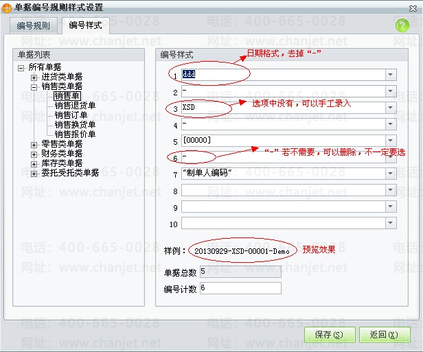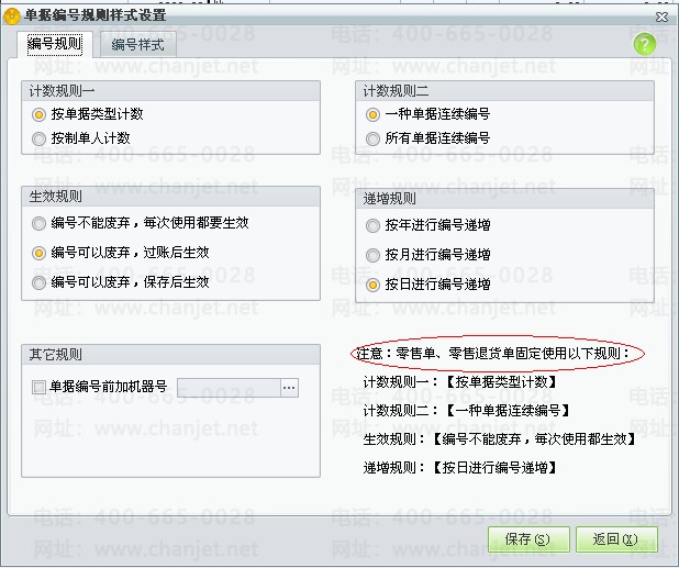 注:此处设计的单据编号样式对零售单、零售退货单无效,零售类单据的编号规则是软件已经设计好的,不可以更改。如图下所示