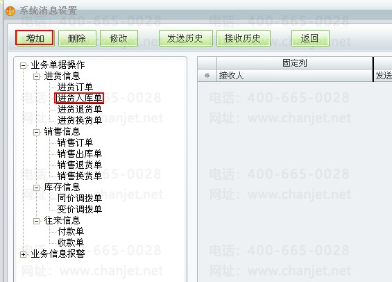 进货入库单操作提醒设置:进货入库单未审核过账单据通知下列人员审核,添加有审核进货单权限的操作员.