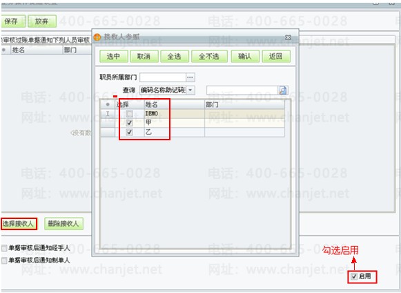 选择未审核过账进货入库单据的审核人,如甲,乙。确认后勾选‘启用’
