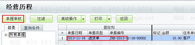 点击‘查看’,就能通过条件选择,打开经营历程,找到进货单,点击‘单据审核’